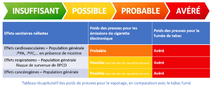 En l’état des connaissances actuelles, les risques sanitaires liés au vapotage ne dépassent, ni en gravité ni en niveau de preuve, ceux observés pour le tabac fumé ; l’absence de combustion reste l’avantage majeur du vapotage.
